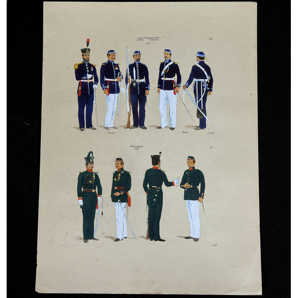 EspañolJOSÉ WASTH RODRIGUES (São Paulo, 1891 - Rio de Janeiro, 1957) 32x23 cm. Aquareladas à mão ESTAMPA N. 89 —CORPOS E COMPANHIAS FIXOS: Artilharia e Cavalaria — 1856: Tenente em grande uniforme (Artilharia do Amazonas) ; Alferes em pequeno uniforme (Idem); Praça, mesmo uniforme (Idem); Alferes em grande uniforme (Cavallaria do Paraná); Praça, mesmo uniforme (Idem). ESTAMPA N. 90 — 8° BATALHÃO DE CAÇADORES — 1856: Alferes em grande uniforme; Alferes em pequeno uniforme; Soldado em grande uniforme; Soldado em pequeno uniforme. Impresso em Paris, ano 1922:A. FERROUD. - F. FERROUD, Succ. 127, Boulevard Saint German, 127. Um exaustivo e valoroso trabalho consagrado como um dos maiores clássicos relacionados ao tema. Raríssima obra da qual foram editadas apenas 500 unidades e aquareladas à mão. A Coleção Iconográfica Uniformes Militares compõe o Arquivo Histórico do Museu Histórico Nacional. O pintor José Wasth Rodrigues foi um grande historiador e estudioso da arquitetura colonial no Brasil. Seus estudos do início do século 20 foram incorporados ao livro “Documentário Arquitetônico”, no qual o autor se dedica à complexidade do patrimônio nacional. Publicado pela primeira vez em 1940, o estudo reúne uma série de elementos que podem ser vistos também nas obras do acervo do Museu do Ipiranga.