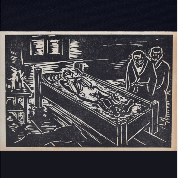 EspañolOswaldo Goeldi Med. 14 x 23 cm. Clicheria, para as ilustrações do livro "Recordações da Casa dos Mortos" de Dostoiévski. Embora Goeldi tenha criado as obras originalmente como xilogravuras em madeira, a clicheria metálica que reproduzia fielmente o desenho entalhado