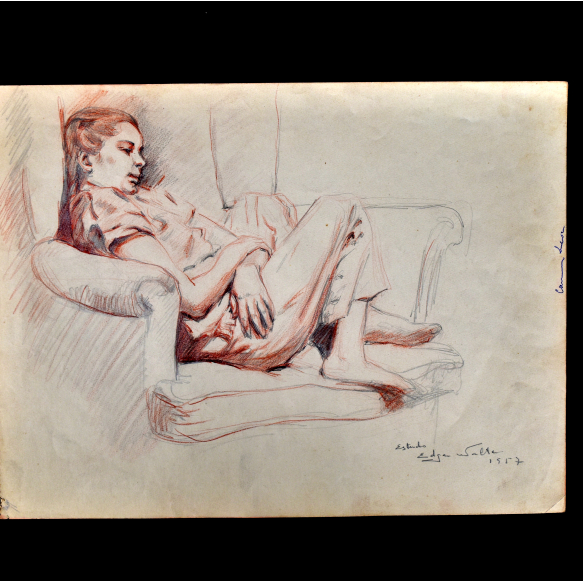 EspañolEDGAR WALTER (1917 – 1994) DESENHO GRAFITE E SANGUÍNEA. ESTUDO DATADO 1957. MENINA SANTADA NA POLTRONA. MED: 23 X 30 CM.