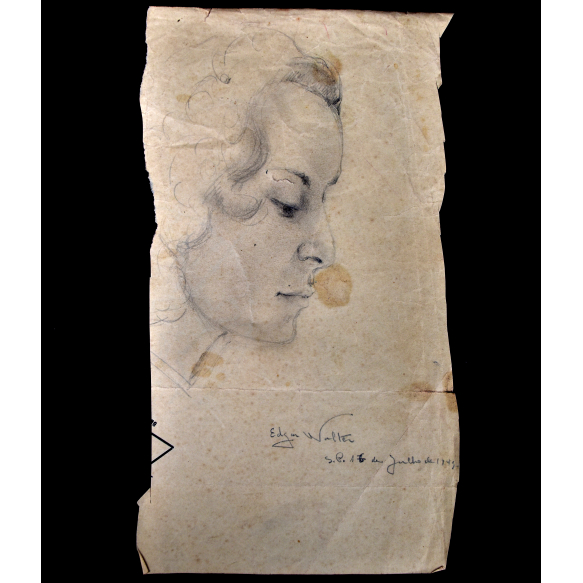 EspañolEDGAR WALTER (1917 – 1994) DESENHO GRAFITE MODELO VIVO. PERFIL DE UMA MULHER DATADO 16 DE JULHO 1445 MED: 23 X 12 CM.