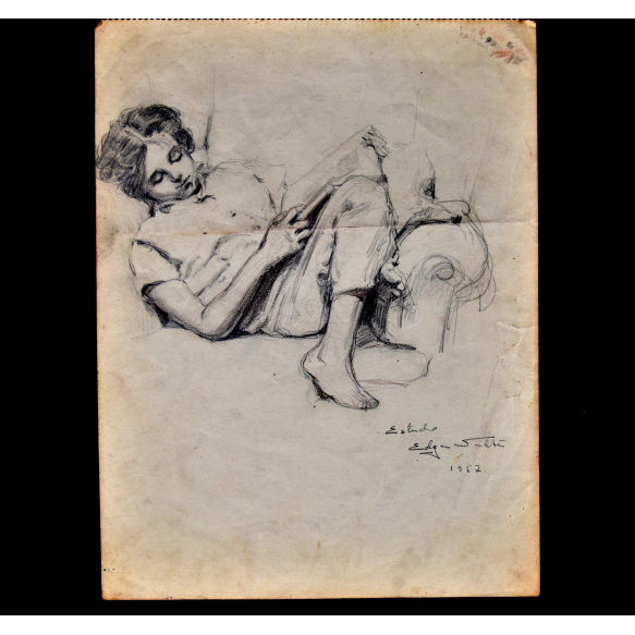 EspañolEDGAR WALTER (1917 – 1994) DESENHO GRAFITE. MENINO ESTUDANDO NA POLTRONA. DATADO: 1957 MED: 29 X 22 CM.