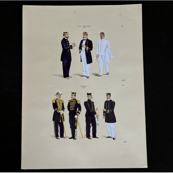 EspañolJOSÉ WASTH RODRIGUES (São Paulo, 1891 - Rio de Janeiro, 1957) 32x23 cm. Aquareladas à mão ESTAMPA N. 161 — CORPO DE SAUDE - 1893: a) Alferes Pharmaceutico em segundo uniforme; b) Major Medico, idem; c) Alferes Pharmaceutico, idem. ESTAMPA N. 162 —ESTADO MAIOR GENERAL — 1894: a) Marechal, primeiro uniforme; b) General de Brigada, segundo; c) Idem, terceiro; d) Idem, Inspector de Saude, quarto. Impresso em Paris, ano 1922: A. FERROUD. - F. FERROUD, Succ. 127, Boulevard Saint German, 127. Um exaustivo e valoroso trabalho consagrado como um dos maiores clássicos relacionados ao tema. Raríssima obra da qual foram editadas apenas 500 unidades e aquareladas à mão. A Coleção Iconográfica Uniformes Militares compõe o Arquivo Histórico do Museu Histórico Nacional. O pintor José Wasth Rodrigues foi um grande historiador e estudioso da arquitetura colonial no Brasil. Seus estudos do início do século 20 foram incorporados ao livro “Documentário Arquitetônico”, no qual o autor se dedica à complexidade do patrimônio nacional. Publicado pela primeira vez em 1940, o estudo reúne uma série de elementos que podem ser vistos também nas obras do acervo do Museu do Ipiranga.