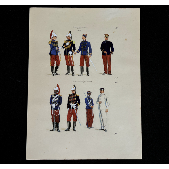 EspañolJOSÉ WASTH RODRIGUES (São Paulo, 1891 - Rio de Janeiro, 1957) 32x23 cm. Aquareladas à mão ESTAMPA N. 179 — CAVALLARIA E ARTILHARIA DE CAMPANHA — 1903: Capitão de Cavalaria, primeiro uniforme; Tenente de Artilharia, idem; Idem de Cavallaria, terceiro uniforme; Official de Artilharia, segundo. ESTAMPA N. 180 —CAVALLARIA E ARTILHARIA — 1903: Soldado de Cavallaria, grande gala; Cabo de Artilharia, idem; Soldado de Cavallaria, segundo uniforme; Anspessada de Artilharia, idem. Impresso em Paris, ano 1922: A. FERROUD. - F. FERROUD, Succ. 127, Boulevard Saint German, 127. Um exaustivo e valoroso trabalho consagrado como um dos maiores clássicos relacionados ao tema. Raríssima obra da qual foram editadas apenas 500 unidades e aquareladas à mão. A Coleção Iconográfica Uniformes Militares compõe o Arquivo Histórico do Museu Histórico Nacional. O pintor José Wasth Rodrigues foi um grande historiador e estudioso da arquitetura colonial no Brasil. Seus estudos do início do século 20 foram incorporados ao livro “Documentário Arquitetônico”, no qual o autor se dedica à complexidade do patrimônio nacional. Publicado pela primeira vez em 1940, o estudo reúne uma série de elementos que podem ser vistos também nas obras do acervo do Museu do Ipiranga.