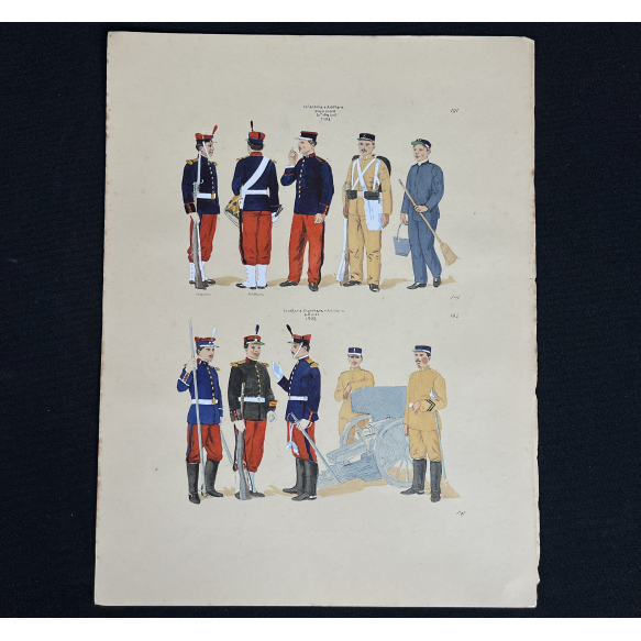EspañolJOSÉ WASTH RODRIGUES (São Paulo, 1891 - Rio de Janeiro, 1957) 32x23 cm. Aquareladas à mão ESTAMPA N. 191 — INFANTARIA E ARTILHARIA — 1908: Soldado de Infantaria, grande gala; Tambor de Artilharia de Posição, idem; Soldado de Infantaria com equipamento antigo; Idem com uniforme de serviço interno (brim mescla). ESTAMPA N. 192 — CAVALLARIA, ENGENHARIA E ARTILHARIA - 1908: Soldado de Cavallaria, grande gala; Forriel de Engenharia, idem; Soldado de Artilharia de Campanha, idem; Idem de uniforme de brim kaki; Idem de Cavallaria com o mesmo uniforme. Impresso em Paris, ano 1922: A. FERROUD. - F. FERROUD, Succ. 127, Boulevard Saint German, 127. Um exaustivo e valoroso trabalho consagrado como um dos maiores clássicos relacionados ao tema. Raríssima obra da qual foram editadas apenas 500 unidades e aquareladas à mão. A Coleção Iconográfica Uniformes Militares compõe o Arquivo Histórico do Museu Histórico Nacional. O pintor José Wasth Rodrigues foi um grande historiador e estudioso da arquitetura colonial no Brasil. Seus estudos do início do século 20 foram incorporados ao livro “Documentário Arquitetônico”, no qual o autor se dedica à complexidade do patrimônio nacional. Publicado pela primeira vez em 1940, o estudo reúne uma série de elementos que podem ser vistos também nas obras do acervo do Museu do Ipiranga.