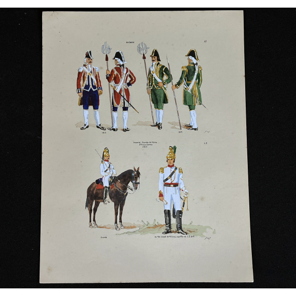 EspañolJOSÉ WASTH RODRIGUES (São Paulo, 1891 - Rio de Janeiro, 1957) 32x23 cm. Aquareladas à mão ESTAMPA N. 47 — Paço Imperial da Côrte: Official de Archeiros de 1815 a 1825; Guarda de Archeiros, idem; Guarda de Archeiros, de 1825 em deante: Official de Archeiros, idem. ESTAMPA N. 48 —IMPERIAL GUARDA DE HONRA — 1825: Guarda a cavallo, grande gala de Milicias), grande rala. Capitão (ex-Tenente-Coronel de Milicias), grande gala. Impresso em Paris, ano 1922:A. FERROUD. -F. FERROUD, Succ. 127, Boulevard Saint German, 127. Um exaustivo e valoroso trabalho consagrado como um dos maiores clássicos relacionados ao tema. Raríssima obra da qual foram editadas apenas 500 unidades e aquareladas à mão. A Coleção Iconográfica Uniformes Militares compõe o Arquivo Histórico do Museu Histórico Nacional. O pintor José Wasth Rodrigues foi um grande historiador e estudioso da arquitetura colonial no Brasil. Seus estudos do início do século 20 foram incorporados ao livro “Documentário Arquitetônico”, no qual o autor se dedica à complexidade do patrimônio nacional. Publicado pela primeira vez em 1940, o estudo reúne uma série de elementos que podem ser vistos também nas obras do acervo do Museu do Ipiranga.