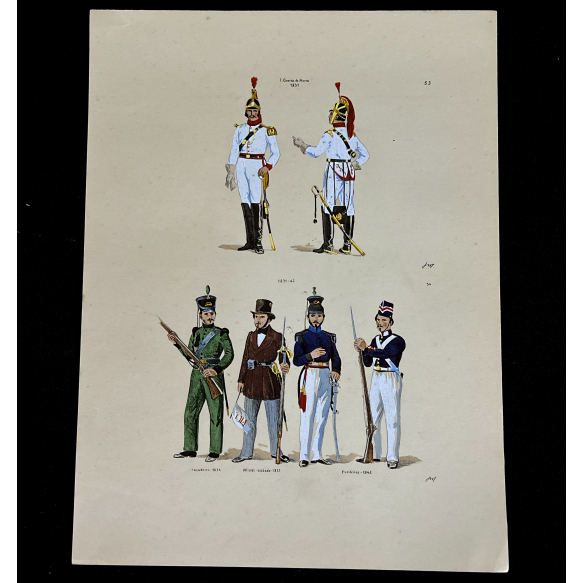 EspañolJOSÉ WASTH RODRIGUES (São Paulo, 1891 - Rio de Janeiro, 1957) 32x23 cm. Aquareladas à mão ESTAMPA N. 53 — IMPERIAL GUARDA DE HONRA - 1831: Alferes em grande gala; Guarda em grande gala. ESTAMPA N. 54 — 1831 a 1834: Soldado de Caçadores em 1834; Soldado do Batalhão de Officiaes — Soldados em 1831; Official de Caçadores; Soldado de Fusileiros, pequeno uniforme. Impresso em Paris, ano 1922:A. FERROUD. -F. FERROUD, Succ. 127, Boulevard Saint German, 127. Um exaustivo e valoroso trabalho consagrado como um dos maiores clássicos relacionados ao tema. Raríssima obra da qual foram editadas apenas 500 unidades e aquareladas à mão. A Coleção Iconográfica Uniformes Militares compõe o Arquivo Histórico do Museu Histórico Nacional. O pintor José Wasth Rodrigues foi um grande historiador e estudioso da arquitetura colonial no Brasil. Seus estudos do início do século 20 foram incorporados ao livro “Documentário Arquitetônico”, no qual o autor se dedica à complexidade do patrimônio nacional. Publicado pela primeira vez em 1940, o estudo reúne uma série de elementos que podem ser vistos também nas obras do acervo do Museu do Ipiranga.