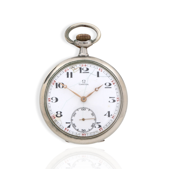 Omega - Caixa de metal prateado. Cerca de 51mm de diâmetro. Movimento com corda e ajuste pela coroa (stem-set). Mostrador de porcelana. Fabricado na Suíça.