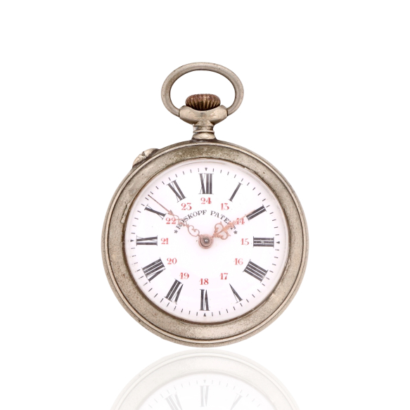 Roskopf Patent - Relógio de Bolso, caixa de metal prateado. Cerca de 42mm de diâmetro. Movimento com corda e ajuste pela coroa (pin-set). Mostrador de porcelana.