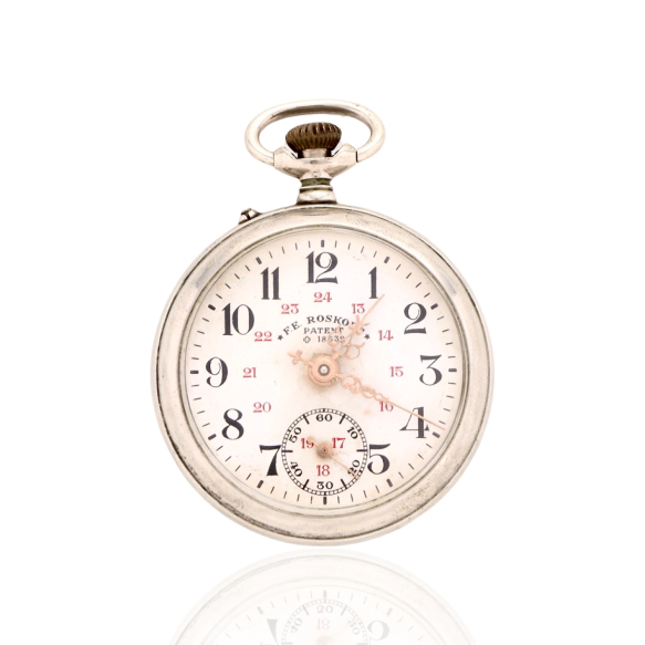 F.E.Roskopf - Relógio de Bolso, caixa de metal prateado. Cerca de 45mm de diâmetro. Movimento com corda e ajuste pela coroa (pin-set). Mostrador esmaltado