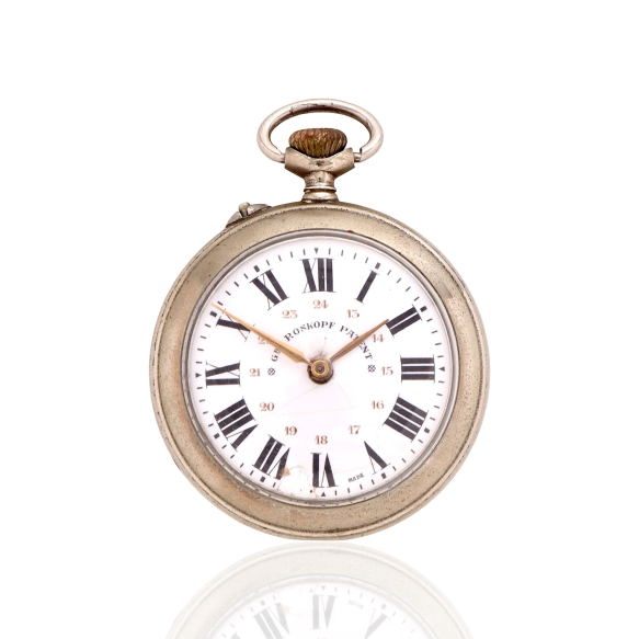Georges Roskopf - Relógio de Bolso, caixa de metal prateado. Cerca de 44mm de diâmetro. Movimento com corda e ajuste pela coroa (pin-set). Mostrador de porcelana.