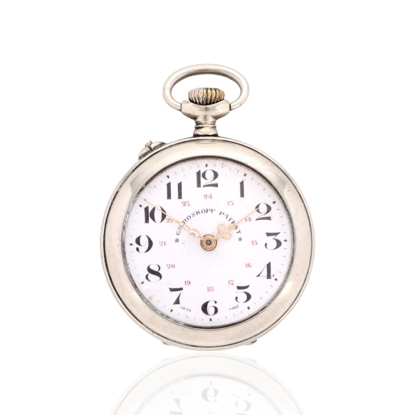 Georges Roskopf - Relógio de Bolso, caixa de metal prateado. Cerca de 43mm de diâmetro. Movimento com corda e ajuste pela coroa (pin-set). Mostrador de porcelana.