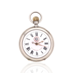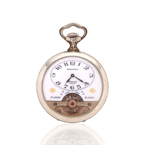 Hebdomas Arnex - Relógio de Bolso, caixa de metal prateado. Cerca de 50mm de diâmetro. Movimento com corda e ajuste pela coroa (stem-set). Mostrador de porcelana. Fabricado na Suíça.