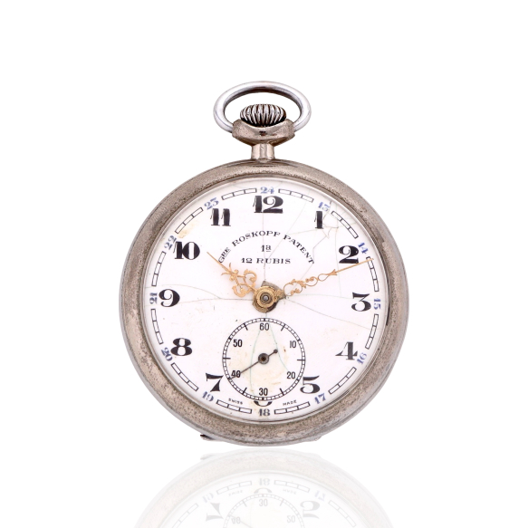 Georges Roskopf - Relógio de Bolso, caixa de metal prateado. Cerca de 52mm de diâmetro. Movimento com corda e ajuste pela coroa (pin-set). Mostrador de porcelana.