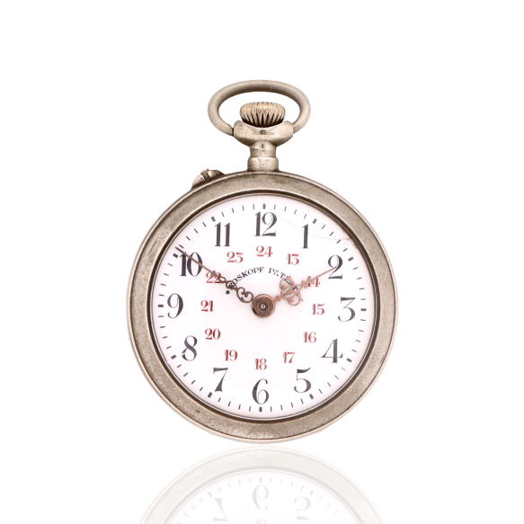Roskopf Patent - Relógio de Bolso, caixa de metal prateado. Cerca de 46mm de diâmetro. Movimento com corda e ajuste pela coroa (pin-set). Mostrador de porcelana.