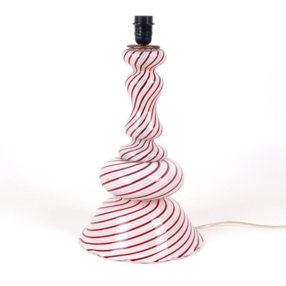 MAZZEGA – Imponente luminária italiana de mesa em vidro artístico de Murano, produzida pela renomada casa Mazzega. A peça apresenta corpo sinuoso em mesafiligrana, técnica tradicional veneziana que combina fios de vidro branco e vermelho entrelaçados, resultando em um efeito óptico elegante e sofisticado. Com design escultural e proporções equilibradas, esta luminária é um exemplar notável do trabalho artesanal italiano do pós-guerra. Dimensões: Altura 56 cm