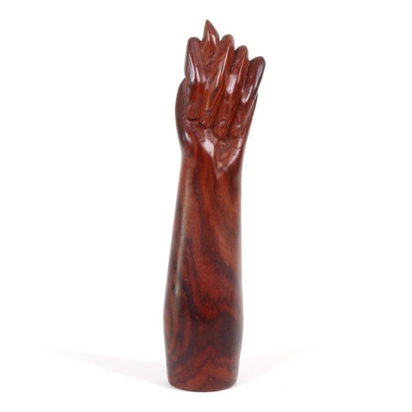 Figa em Jacarandá. Escultura em madeira de jacarandá, representando uma figa — símbolo tradicional de proteção e boa sorte nas culturas afro-brasileira e mediterrânea. A peça apresenta linhas firmes e polimento acetinado que evidencia o veio nobre da madeira. Dimensões: Altura 23 cm