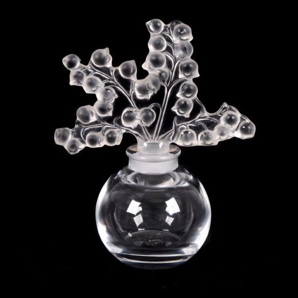 RENÉ LALIQUE - Elegante perfumeiro francês em cristal translúcido, criação de René Lalique, mestre vidreiro e um dos maiores nomes do Art Déco. O modelo “Clairefontaine”, concebido em 1931, apresenta tampa decorada com delicadas flores em acabamento satiné, contrastando com o corpo polido e transparente. Peça de coleção assinada “Lalique France” na base. A tampa encontra-se levemente emperrada, sem prejuízo estético. Dimensões: Altura 12 cm × Largura 9,7 cm × Profundidade 6 cm