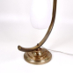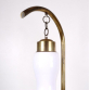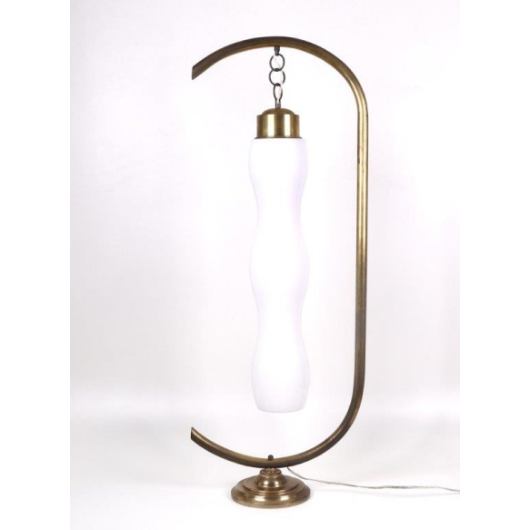 Elegante luminária italiana de mesa datada da metade do século XX, com design refinado e linhas geométricas marcantes. A estrutura arqueada em latão polido, apoiada sobre uma base circular escalonada, sustenta um difusor em vidro leitoso opalino de forma orgânica, caracterizado por curvas suaves e sinuosas. O pendente central, suspenso por gancho metálico, confere leveza visual e proporciona iluminação difusa e uniforme, tornando a peça ideal para compor ambientes sofisticados e contemporâneos. Um exemplar que alia funcionalidade e escultura, representando o melhor do design italiano do período modernista. Dimensões: Altura 107 cm × Largura 40 cm