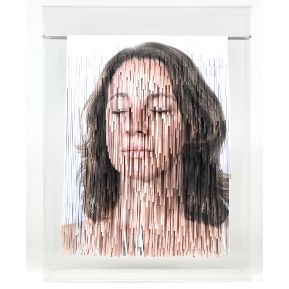 JAVIER BELLOMO CORIA - “Magui” – Série Un Soplo de Aire, 2018. Entre a fotografia, a escultura e a instalação, Javier Bellomo Coria propõe em sua série Un Soplo de Aire uma reflexão sobre a efemeridade da imagem e a natureza fragmentada da percepção. Em Magui, o artista desconstrói o retrato por meio de tiras verticais de papel texturizado suspensas em acrílico, criando uma superfície translúcida e vibrante. Dimensões: Altura 50 cm × Largura 38 cm × Profundidade 15 cm