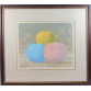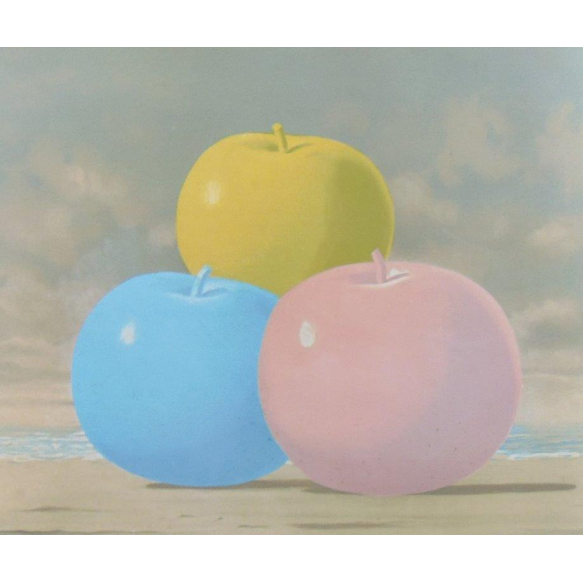 RENÉ MAGRITTE – Trois Pommes (Três Maçãs). Litografia em cores sobre papel, 1960. Assinada por Georgette Magritte, esposa do artista, no canto inferior esquerdo, e marcada Prova do Artista (Epreuve d’Artiste) no canto inferior direito. Nesta composição, Magritte representa três maçãs de cores vibrantes — amarela, azul e rosa — dispostas sobre uma paisagem costeira sob um céu enevoado. A obra reflete o caráter poético e enigmático típico do artista surrealista belga, que questiona as convenções da percepção e o diálogo entre o real e o imaginário. Dimensões: 53 × 65 cm.