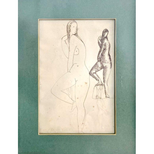 VICTOR BRECHERET - Estudo para Escultura, c. 1947. Nanquim sobre papel, assinado no canto inferior direito. Obra com certificado de autenticidade emitido por Victor Brecheret Filho. Ex Coleção Diogenes Amaral. Desenho original em nanquim sobre papel, representando duas figuras femininas em pose de estudo, explorando proporção e movimento — elementos centrais no processo criativo escultórico de Victor Brecheret. Realizado por volta de 1947, o trabalho demonstra o traço seguro e a sensibilidade plástica do artista, precursor da escultura modernista brasileira e autor de monumentos emblemáticos como o Monumento às Bandeiras (São Paulo). Dimensões: 30 × 20 cm
