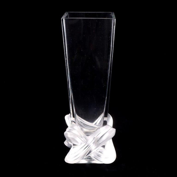 LALIQUE - Imponente vaso modelo Lucca da década de 1980, produzido pela maison francesa Lalique. De forma quadrangular e linhas elegantes, apresenta na base um delicado detalhe de fita entrelaçada em relevo — característica do virtuosismo técnico e da pureza formal das criações Lalique. Peça em cristal translúcido e satinê, com selo do fabricante sob a base e assinatura gravada na lateral. Modelo nº 12303, atualmente descontinuado. Dimensões: Altura 28 cm × Largura 9 cm (com ligeiros bicados)