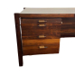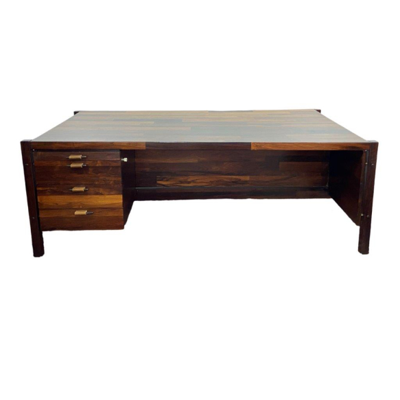 JORGE ZALSZUPIN - Rara e icônica escrivaninha “Presidencial” desenhada por Jorge Zalszupin para a L’Atelier na década de 1960. Executada em jacarandá taqueado com estrutura em madeira maciça, a peça apresenta tampo amplo e linhas sóbrias. Os puxadores originais em couro natural reforçam o caráter artesanal e sofisticado do móvel, símbolo do mobiliário modernista brasileiro. Dimensões: Altura 75 cm × Largura 210 cm × Profundidade 110 cm