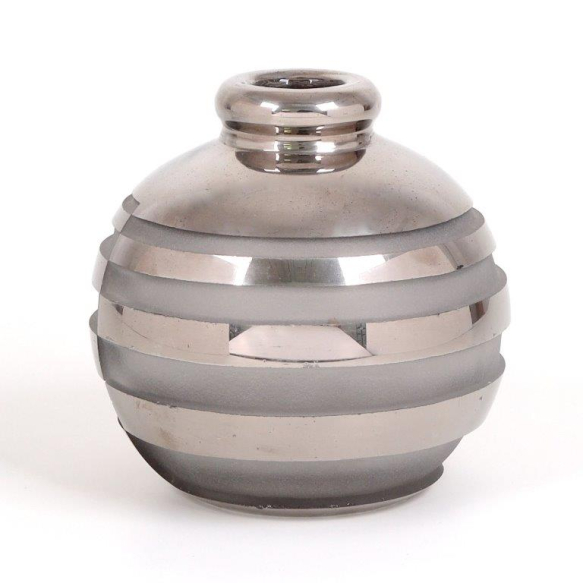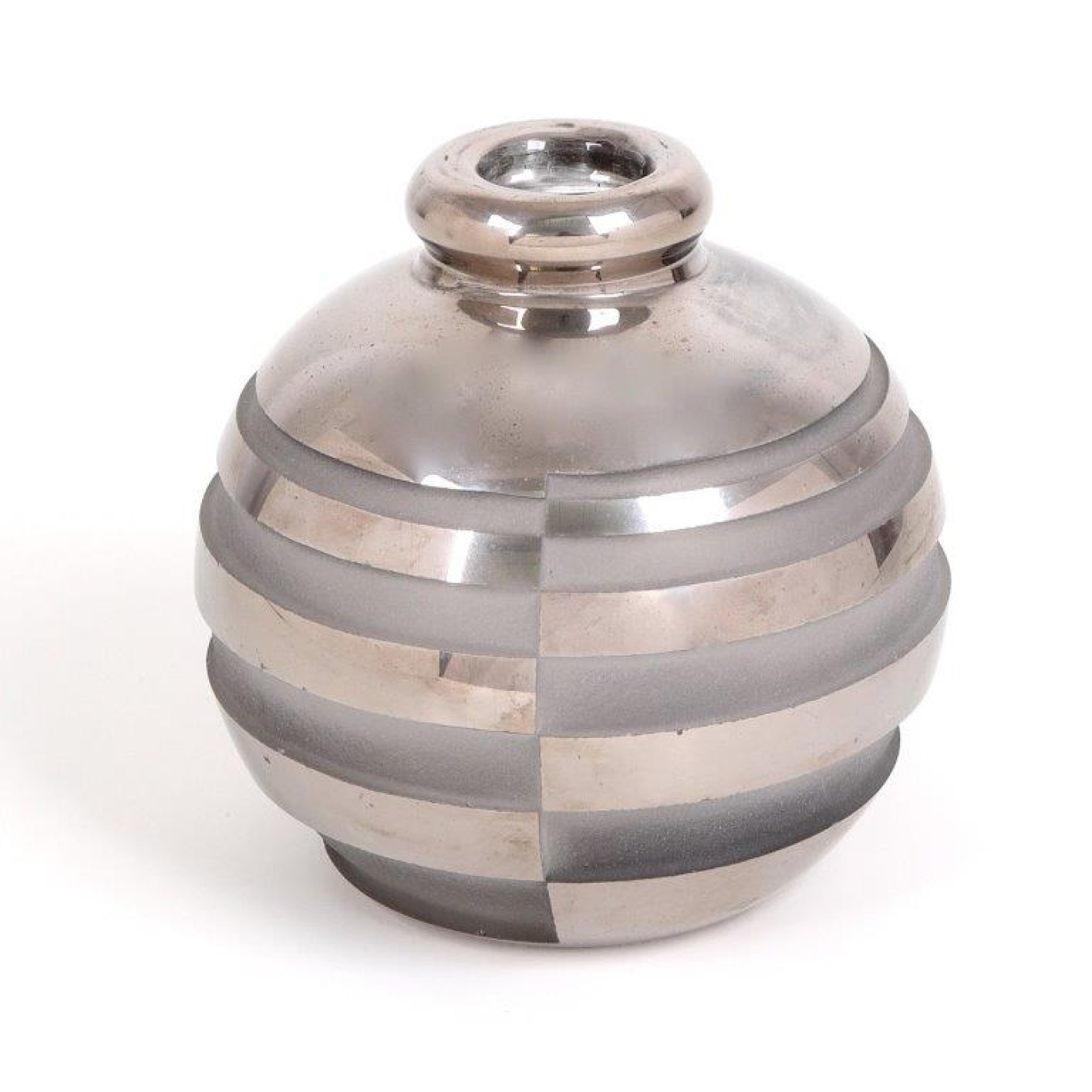 JEAN LUCE - Vaso em vidro metalizado de Jean Luce, apresentando superfície decorada com faixas alternadas em acabamento polido espelhado e fosco, criadas por meio da técnica de gravação em ácido. A peça exemplifica a linguagem refinada e geométrica da produção de Luce na década de 1920, período em que o artista consolidou-se como um dos principais representantes do Art Déco francês. Assinado com cifra incisa do artista. Dimensões: Altura 15 cm × Diâmetro 15 cm