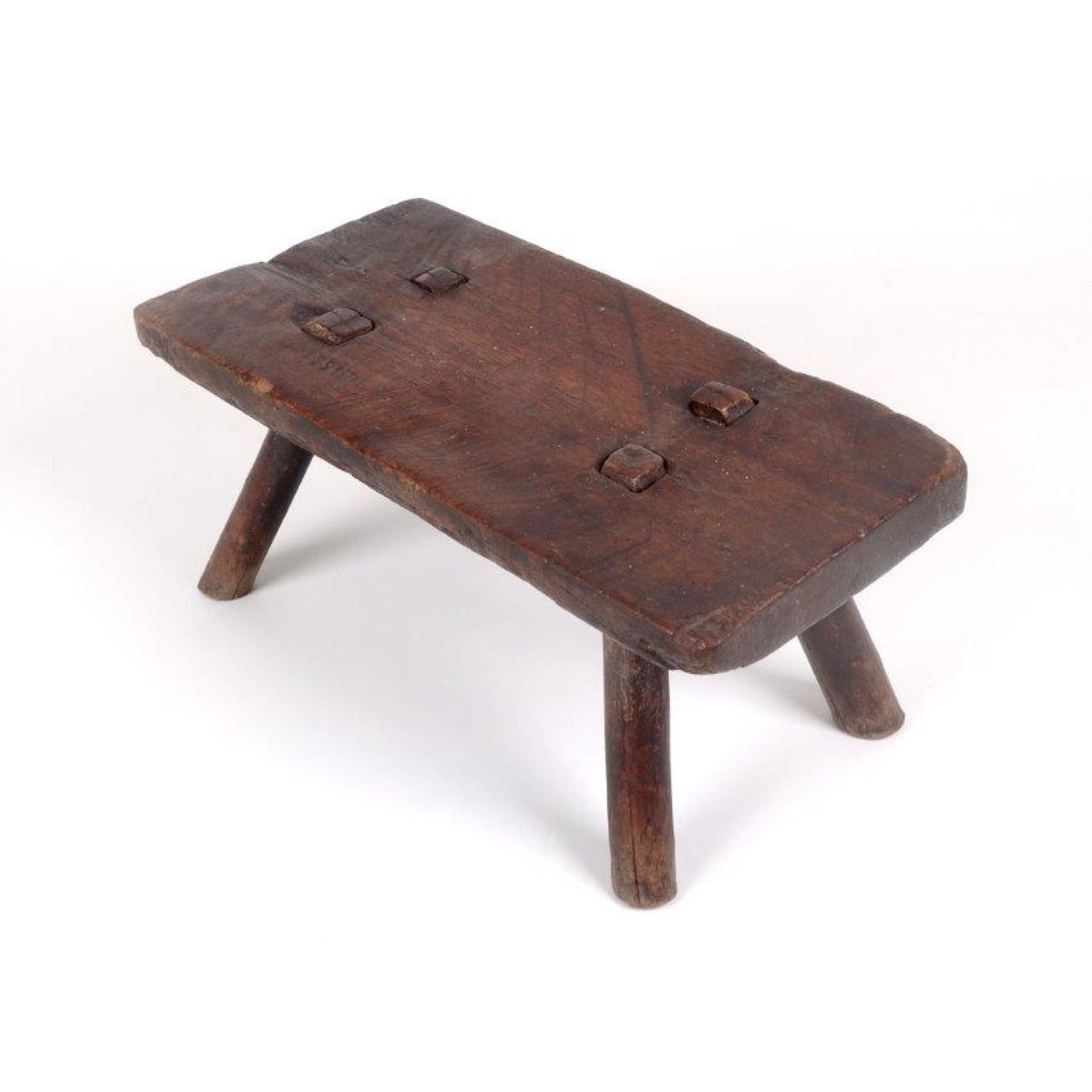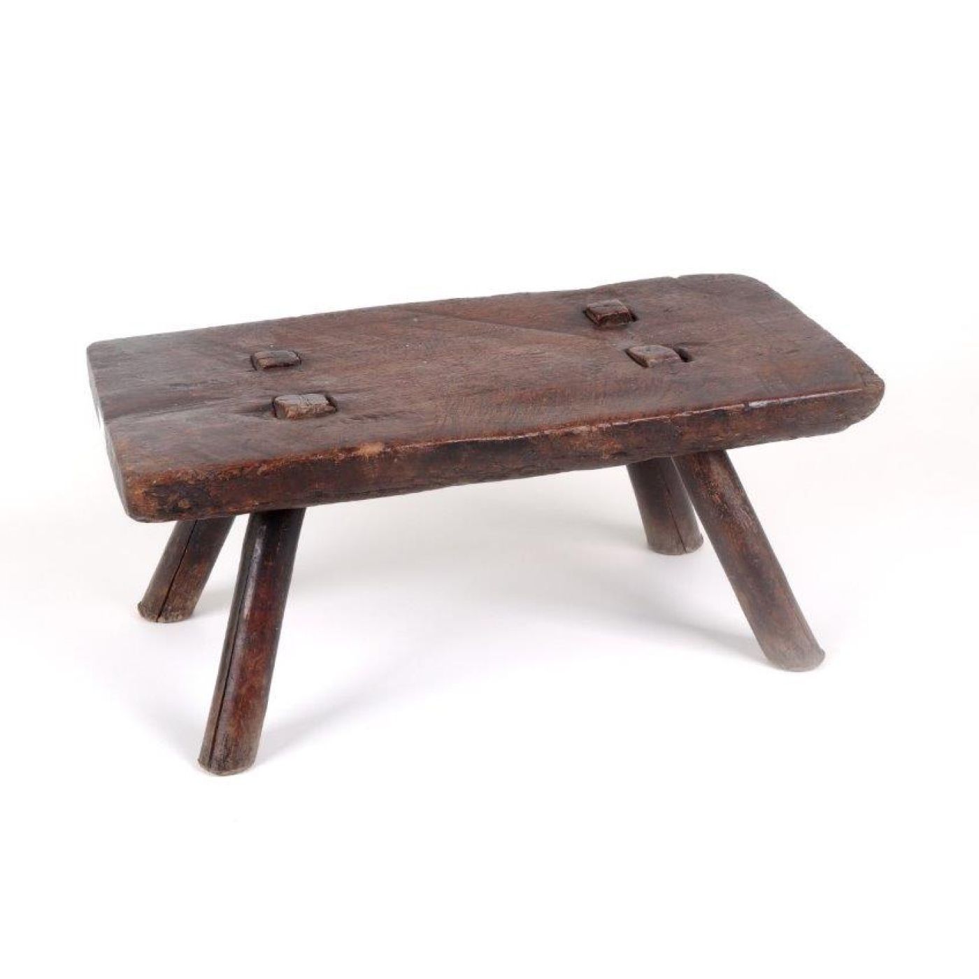 Banco rústico de origem popular, executado em madeira maciça com assento retangular inteiriço e sustentação em quatro pés torneados e inclinados. A peça apresenta belíssima pátina do tempo, ressaltando o caráter artesanal e utilitário do mobiliário rural brasileiro do início do século XX. Dimensões: Altura 17 cm × Largura 38 cm × Profundidade 18 cm