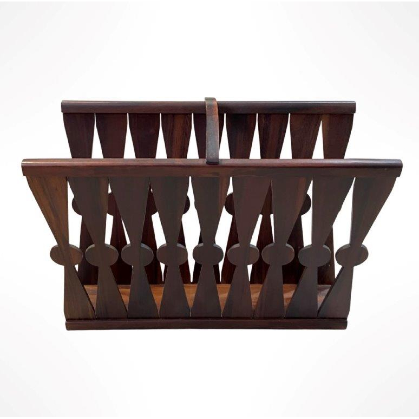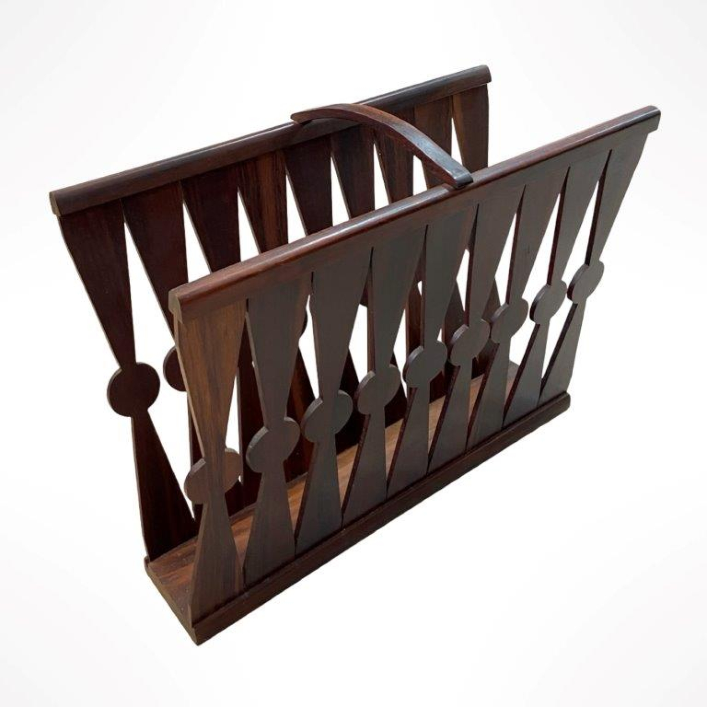 Elegante revisteiro modernista executado em jacarandá maciço, com estrutura geométrica composta por elementos recortados em forma de losangos e círculos, unidos por travessas superiores e alça central. A peça reflete o refinamento do mobiliário brasileiro das décadas de 1950 e 60, período marcado pela valorização da madeira nobre e do trabalho artesanal. Dimensões: Altura 31 cm × Largura 40 cm × Profundidade 18 cm