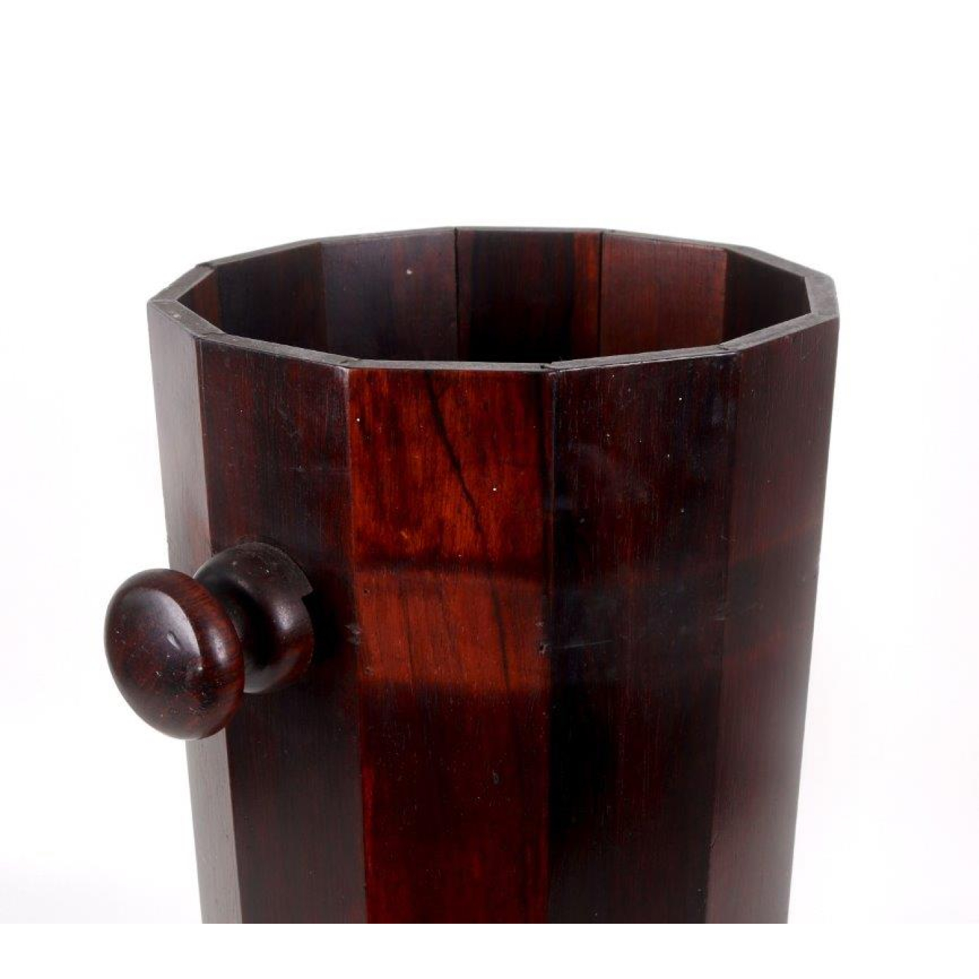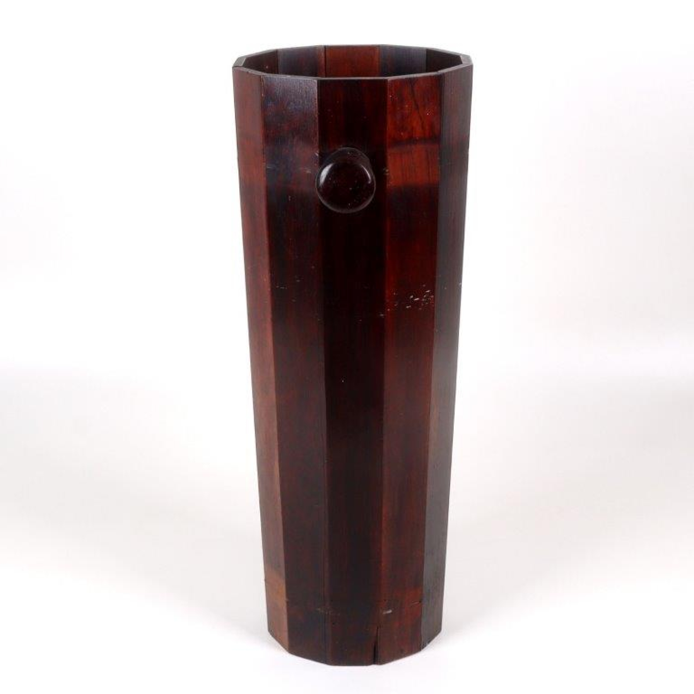 Elegante bengaleiro modernista em jacarandá maciço, de formato hexagonal alongado, com puxadores laterais circulares torneados. A peça reflete o design funcional e refinado do mobiliário brasileiro das décadas de 1950 e 60, valorizando as linhas simples e a nobreza da madeira. Dimensões: Altura 56 cm × Diâmetro superior 20 cm