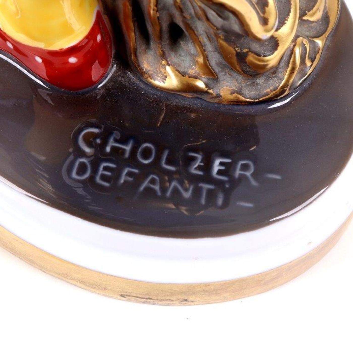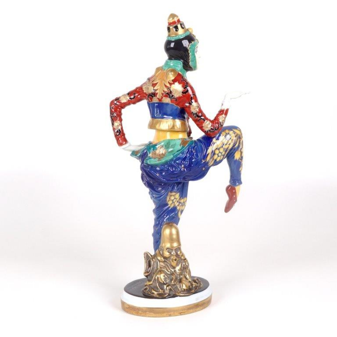 CONSTANTIN HOLZER-DEFANTI – “Koreanischer Tanz” (Dança Coreana), ca. 1919. Elegante escultura em porcelana policromada e dourada, desenhada por Constantin Holzer-Defanti (1878–1938) para a manufatura Rosenthal, Selb, Baviera, cerca de 1920. A peça representa uma figura feminina em trajes orientais, em plena dança, apoiando-se delicadamente sobre uma pequena pagoda. Contêm uma pequena lasca nos dedos. Dimensões: Altura 45 cm