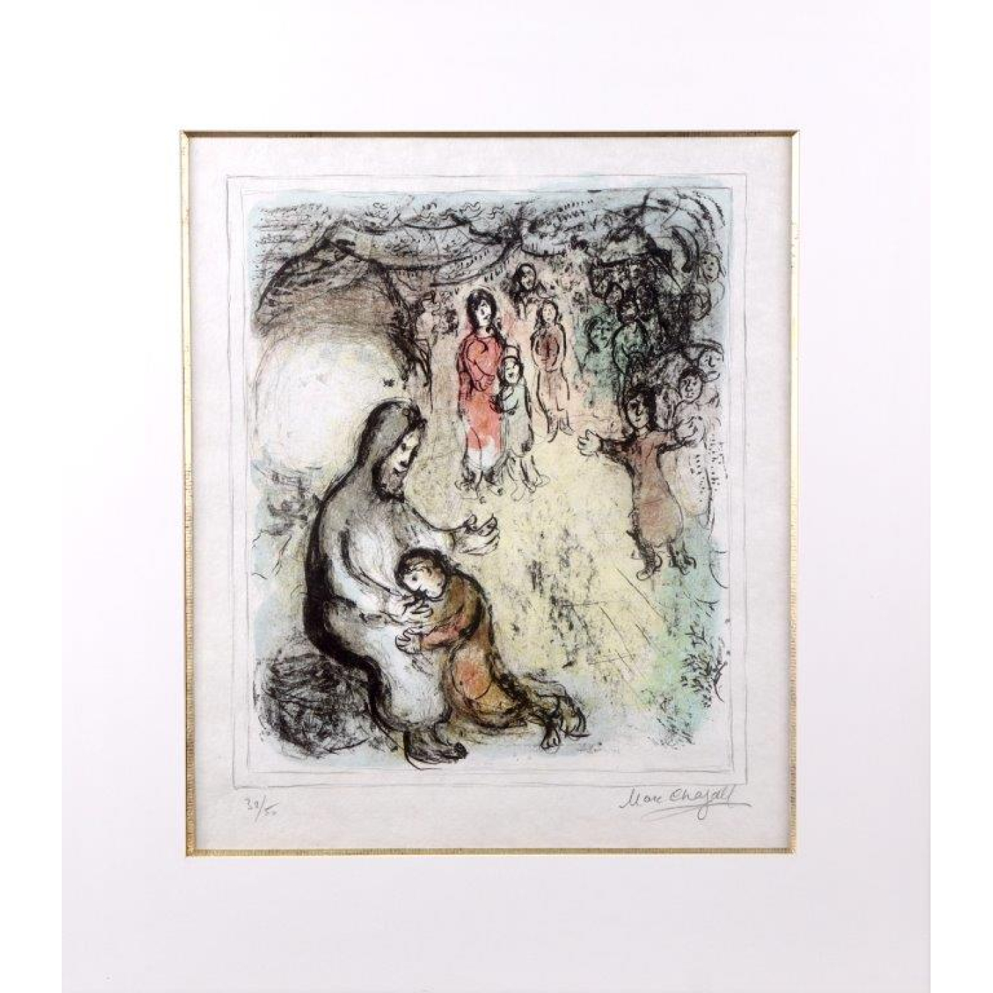 MARC CHAGALL - “La Bénédiction de Jacob” (A Bênção de Jacó), 1979. Litografia em cores sobre papel Japon nacré, assinada e numerada a lápis 39/50, pertencente à série bíblica criada na fase madura do artista. La Bénédiction de Jacob ilustra um dos episódios mais poéticos do Antigo Testamento, tratado por Chagall com sua linguagem onírica e espiritual. Dimensões da imagem: 37,8 × 32 cm. Dimensões da montagem: 44 × 37 cm. Assinatura: A lápis no canto inferior direito.