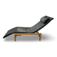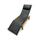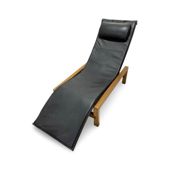 Espreguiçadeira moderna em estrutura de madeira maciça com assento e encosto contínuos revestidos em couro preto natural. Dimensões: Altura 82 cm × Comprimento 160 cm × Largura 60 cm