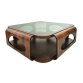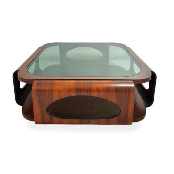 BERTOMEU & CIA - Elegante mesa de centro produzida pela Bertomeu & Cia na década de 1960, em formato quadrangular com estrutura em madeira folheada em jacarandá e laterais com recortes vazados de curvas suaves. O tampo em vidro transparente revela o refinado trabalho de marcenaria característico da manufatura, que se destacou pela combinação entre inovação técnica e estética orgânica. Dimensões: Altura 32 cm × Largura 102 cm × Profundidade 102 cm