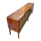 MÓVEIS CIMO - Sofisticado buffet produzido pela Móveis Cimo, apresentando estrutura em madeira nobre, com quatro portas laterais e quatro gavetas centrais. A peça destaca-se pelo discreto detalhe de marchetaria em latão e pelos puxadores em bronze, que conferem elegância e refletem a essência do design modernista brasileiro e a precisão construtiva característica da manufatura Cimo, referência na marcenaria nacional do século XX. Necessita restauro. Dimensões: Altura 86 cm × Comprimento 248 cm × Profundidade 47 cm