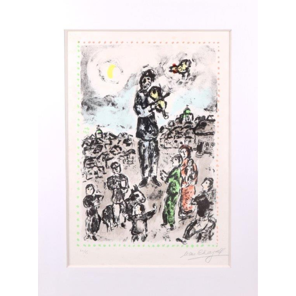 MARC CHAGALL - “Concert sur la Plage” (Concerto na Praça), 1983. Litografia em cores sobre papel, assinada e numerada a lápis 44/50, impressa no Atelier Mourlot, Paris, para a Éditions Maeght. Nesta composição, Chagall recria uma de suas cenas poéticas mais emblemáticas — um concerto em uma praça imaginária — onde músicos, animais e figuras flutuantes se misturam em harmonia cromática e simbólica. Esta peça encontra-se catalogada na exposição comemorativa “100 Anos de Chagall”, realizada pela Dan Galeria, São Paulo, encerrada em 15 de dezembro de 1987, reproduzida na página 23 do catálogo da mostra. Dimensões da imagem: 54 × 37 cm. Assinatura: A lápis no canto inferior direito