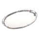Elegante bandeja oval em metal cromado, típica do design Art Déco das décadas de 1920–1930. Apresenta moldura de linhas geométricas e ritmo ondulado nas bordas, com alças laterais formadas por arcos metálicos e esferas ornamentais — elementos característicos da estética moderna e industrial do período. Dimensões: Comprimento 58 cm × Largura 32 cm