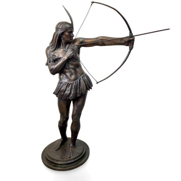 OTTONE ZORLINI – Índio com Arco. Escultura em bronze fundido e patinado, representando um índio em posição de disparar flecha, em gesto de tensão e equilíbrio que evidencia o domínio técnico e o olhar escultórico de Ottone Zorlini. Assinada na base: O. Zorlini. Dimensões: Altura 120,5 cm