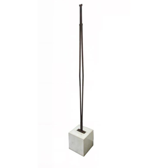 SANDRA TUCCI – Sem Título. Escultura vertical em ferro patinado, de composição minimalista e presença escultórica marcante. Dimensões: Altura 185 cm × Largura 10 cm × Profundidade 10 cm
