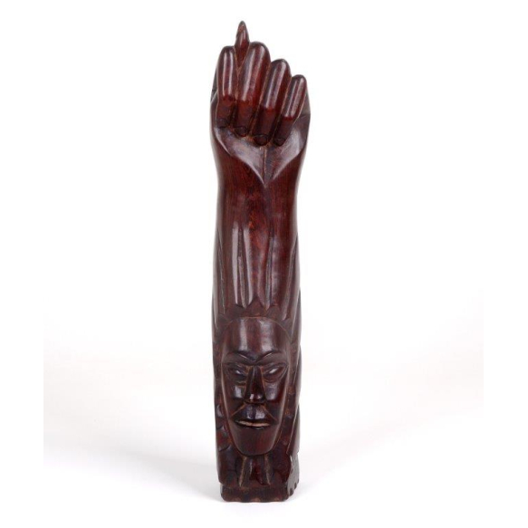Escultura brasileira em madeira de jacarandá, representando uma figa com detalhado entalhe de cabeça de índio na base. Peça de forte caráter simbólico, associada a tradições de proteção e boa sorte, trabalhada com notável precisão artesanal. Dimensões: Altura 32 cm