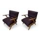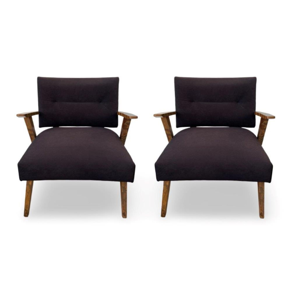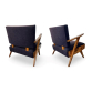 Elegante par de poltronas produzidas na década de 1950, com estrutura em madeira maciça ricamente marchetada, evidenciando o requinte artesanal e a atenção ao detalhe típicos do mobiliário modernista brasileiro do período. Dimensões: Altura 76 cm × Largura 70 cm × Profundidade 56 cm