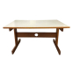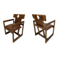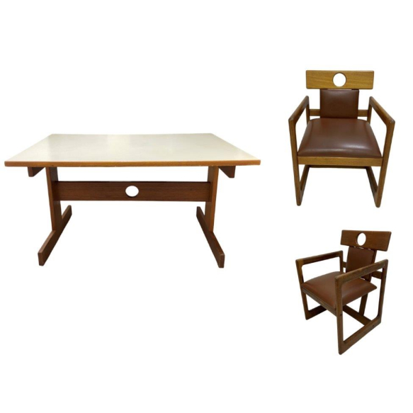 SÉRGIO RODRIGUES - Importante conjunto, desenhado por Sérgio Rodrigues em 1985, composto por quatro poltronas e uma mesa retangular. Catalogado no livro Sérgio Rodrigues – Icatu, pág. 86. As poltronas apresentam estrutura em madeira nobre maciça, com assento e encosto estofados e revestidos em couro natural, expressando o equilíbrio entre robustez e conforto característico da obra do designer. A mesa, de proporções generosas, traz tampo em fórmica branca sobre estrutura em madeira maciça. Dimensões das poltronas: Altura 79 cm × Largura 55 cm × Profundidade 52 cm. Dimensões da mesa: Altura 74 cm × Largura 120 cm × Profundidade 80 cm.