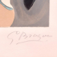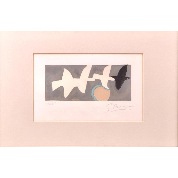 GEORGES BRAQUE - “Quatre Oiseaux”, 1959. Litogravura colorida sobre papel Rives, assinada e numerada a lápis 101/275, integrante da série publicada pela Galerie Maeght em 1959 para o exemplar da revista Derrière Le Miroir n°115. A composição apresenta quatro aves estilizadas sobre fundo em tons vibrantes, tema recorrente na fase tardia do artista, em que a rigidez cubista cede espaço a uma poética mais livre e orgânica. (Acompanha certificado). Dimensões da imagem: 9,4 × 22,6 cm. Dimensões com montagem: 29 × 18 cm