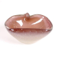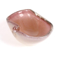 SEGUSO – Elegante bowl italiano em vidro artístico de Murano da década de 1950, atribuído à tradicional manufatura Seguso Vetri d’Arte, executado em formato orgânico de concha. A peça exibe delicada transição de tons entre o âmbar e o rosado, com finas inclusões de pó de ouro e pequenas bolhas aprisionadas no interior da massa vítrea — elementos característicos da produção muranesa do período. Dimensões: Altura 11 cm × Largura 28 cm × Profundidade 12 cm