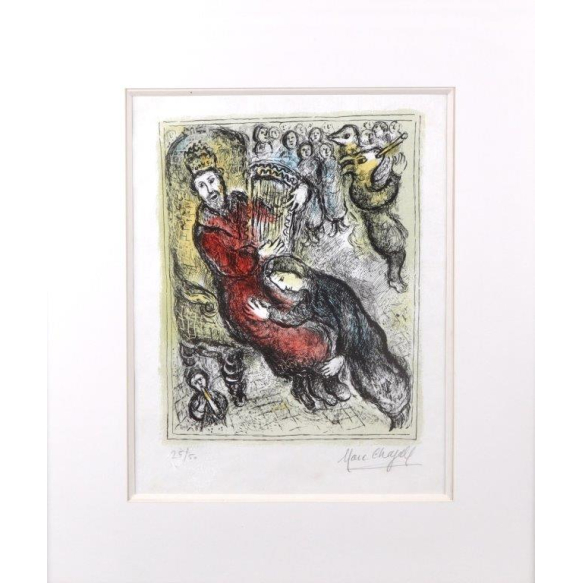MARC CHAGALL - “Le Roi David à la Lyre” (O Rei Davi à Lira), 1979. Litografia em cores sobre papel Japon nacré, assinada e numerada a lápis 25/50, pertencente à série bíblica publicada pela Éditions Maeght em 1979, impressa pelo Atelier Mourlot, em Paris. A obra retrata o Rei Davi tocando sua lira — figura simbólica da inspiração e da ligação entre o humano e o divino. Dimensões da imagem: 42 × 32 cm Assinatura: A lápis no canto inferior direito