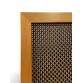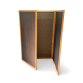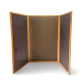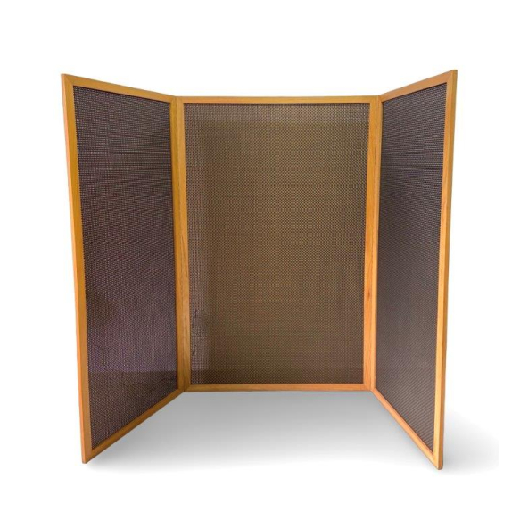 Biombo moderno de três folhas, estrutura em madeira clara e interior revestido com tela metálica perfurada em tom escuro. Dimensões: Altura 156 cm × Largura total 234 cm