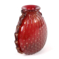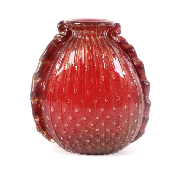 ERCOLE BAROVIER PARA BAROVIER & TOSO - Elegante vaso italiano em vidro artístico de Murano da década de 1960, criação de Ercole Barovier para a renomada manufatura Barovier & Toso. Executado em vidro soprado com aplicação de pó de ouro e delicadas bolhas aprisionadas no corpo (bullicante), o vaso apresenta tonalidade em vermelho translúcido com nuances douradas e textura espiralada. Dimensões: Altura 32 cm × Largura 12 cm × Profundidade 12 cm