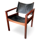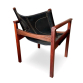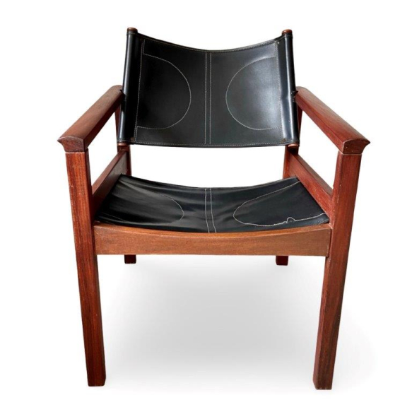 MICHEL ARNOULT - Cadeira Peg Lev, desenhada por Michel Arnoult na década de 1960, executada em madeira nobre maciça com assento e encosto estofados, mantendo o revestimento original de época. A peça apresenta linhas retas e estrutura sólida, refletindo o design funcionalista e racional característico da obra de Arnoult. Dimensões: Altura 77 cm × Largura 58 cm × Profundidade 53 cm