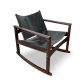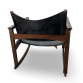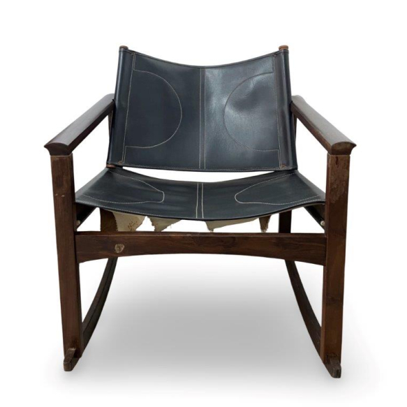 MICHEL ARNOULT - Elegante poltrona de balanço Peg Lev, desenhada por Michel Arnoult no final da década de 1960. Executada em imbuia maciça finamente trabalhada em linhas retas, com assento e encosto em couro natural preto de época, costurado manualmente. Exemplo representativo do design funcionalista e democrático proposto por Arnoult, pioneiro no conceito de “móvel desmontável” e um dos nomes centrais do design moderno brasileiro. Dimensões: Altura 72 cm × Largura 66 cm × Profundidade 75 cm (Trava frontal com pequeno defeito na madeira)